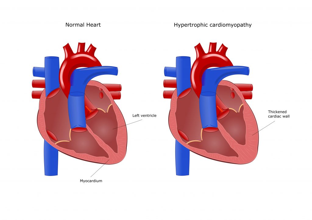 - ассиметричная гипертрофия: наблюдается более часто (почти в 50% случаев) и характеризуется утолщением миокарда в нижней, верхней или средней части левого желудочка и перегородки между правым и левым желудочком, при этом толщина миокарда на некоторых участках может достигать 60 мм;